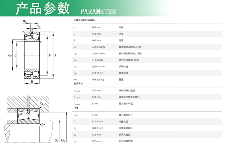 FAG調心滾子軸承 產品特征 1、優化了內部結構以提高載荷承載力 2、新滾動體尺寸,端部為弧形 3、改善了表面質量 4、優化了滾動體和滾道之間的接觸幾何 5、提高了運行精度 6、浮動的中心擋邊 7、新設計的鋼保持架和銅保持架