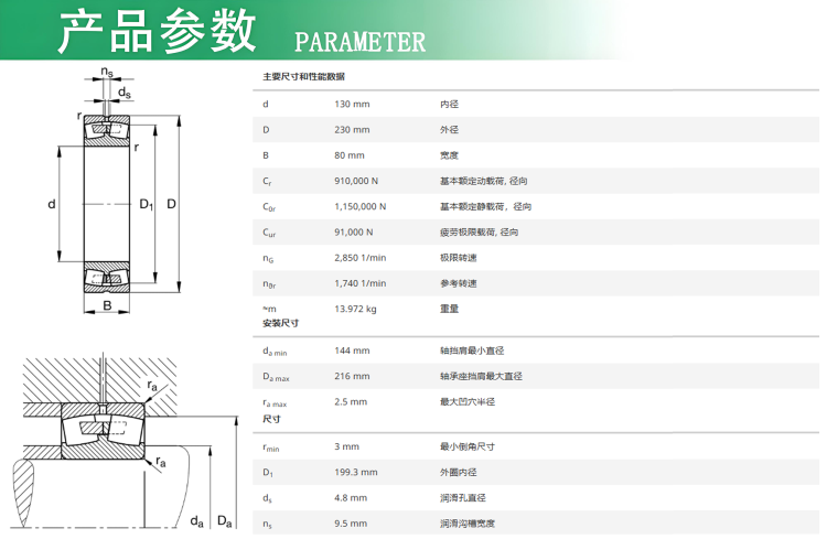 FAG調心滾子軸承 產品特征 1、優化了內部結構以提高載荷承載力 2、新滾動體尺寸,端部為弧形 3、改善了表面質量 4、優化了滾動體和滾道之間的接觸幾何 5、提高了運行精度 6、浮動的中心擋邊 7、新設計的鋼保持架和銅保持架 8、改善滾子引導及潤滑油膜引導 產品優勢 1、外圈內球面滾道可起自動調心作用; 2、可承載雙向軸向力和高徑向力,為適應重載荷場合要求而設計的; 3、E1型為結構增強型,內圈上沒有中擋邊,可使滾子更長,承受載荷更大; 4、XL:X-Life軸承具有更好運動學性能和優化的滾到表面,并由高性能材料制成且不帶中擋邊。因此,在相同工作條件下,軸承的基本額定動載荷和額定壽命顯著提高。 應用設備部位:西門子減速機